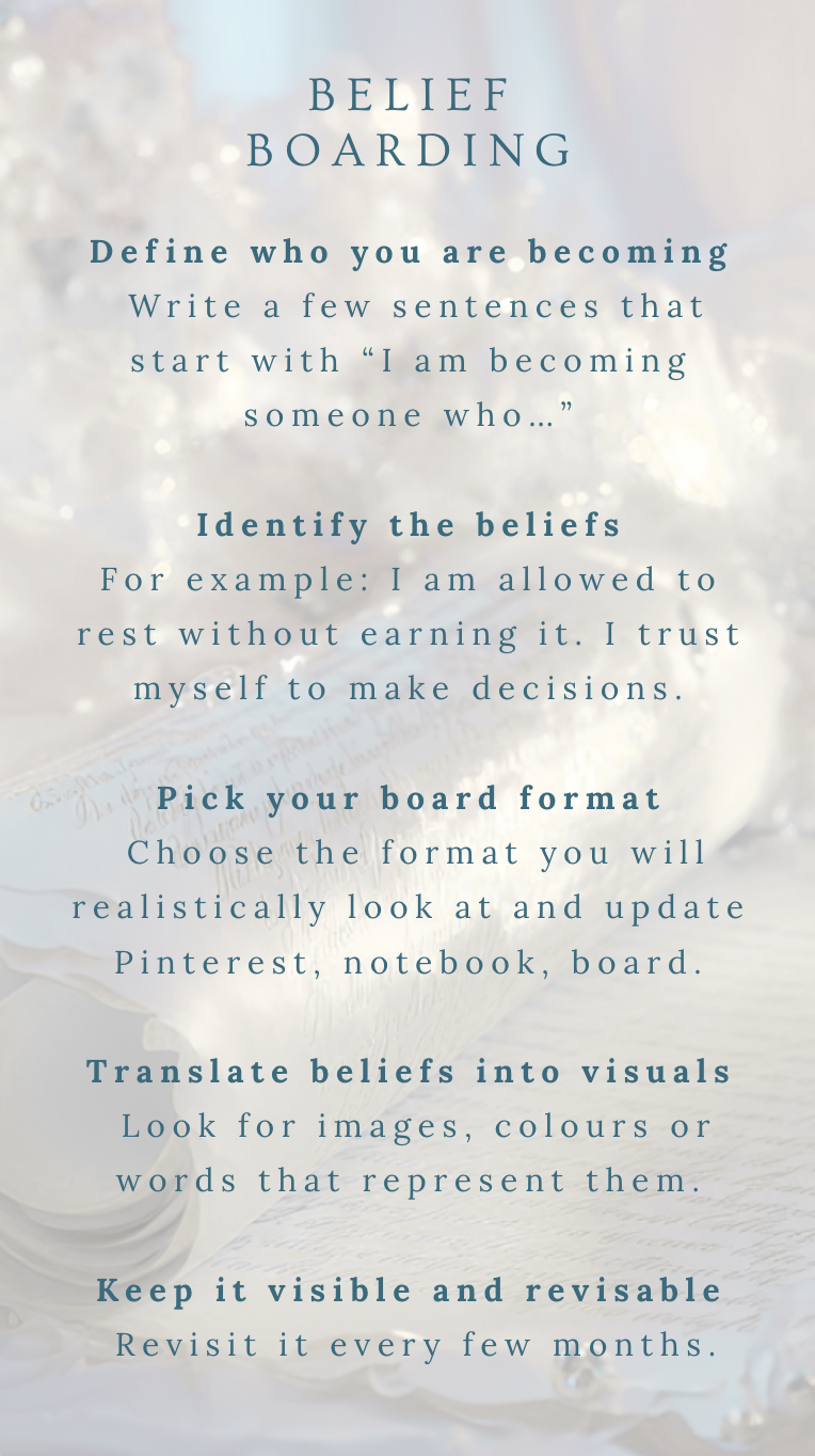 A belief board pulls you back into your own truth. It anchors your actions into values that feel warm, steady and familiar so you stop chasing someone else’s finish line and start shaping a life that feels like home in your own body.